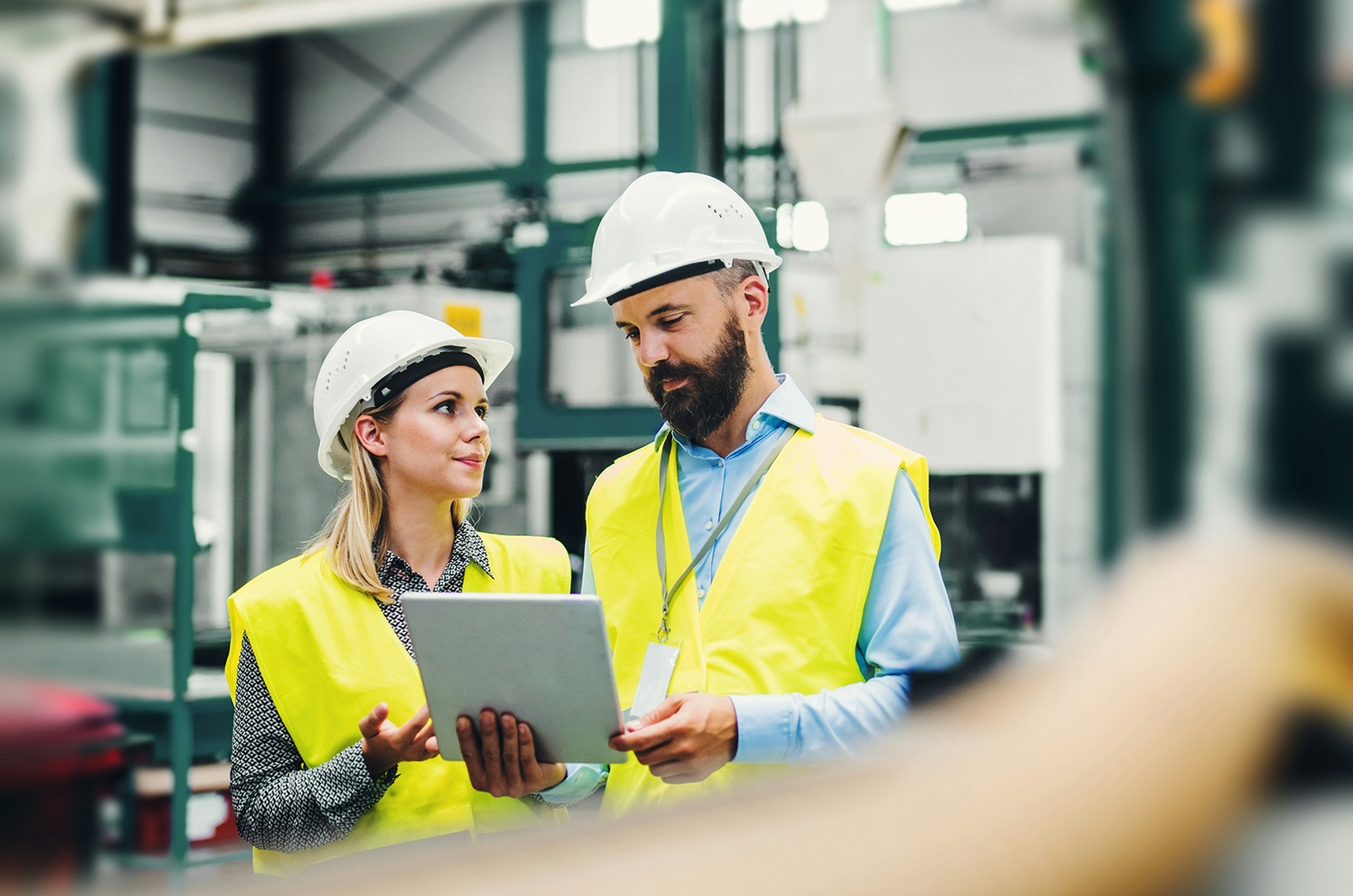 Mann mit Helm und Tablet mit Manufacturing Cloud steht in Fertigungshalle und schaut in Kamera.